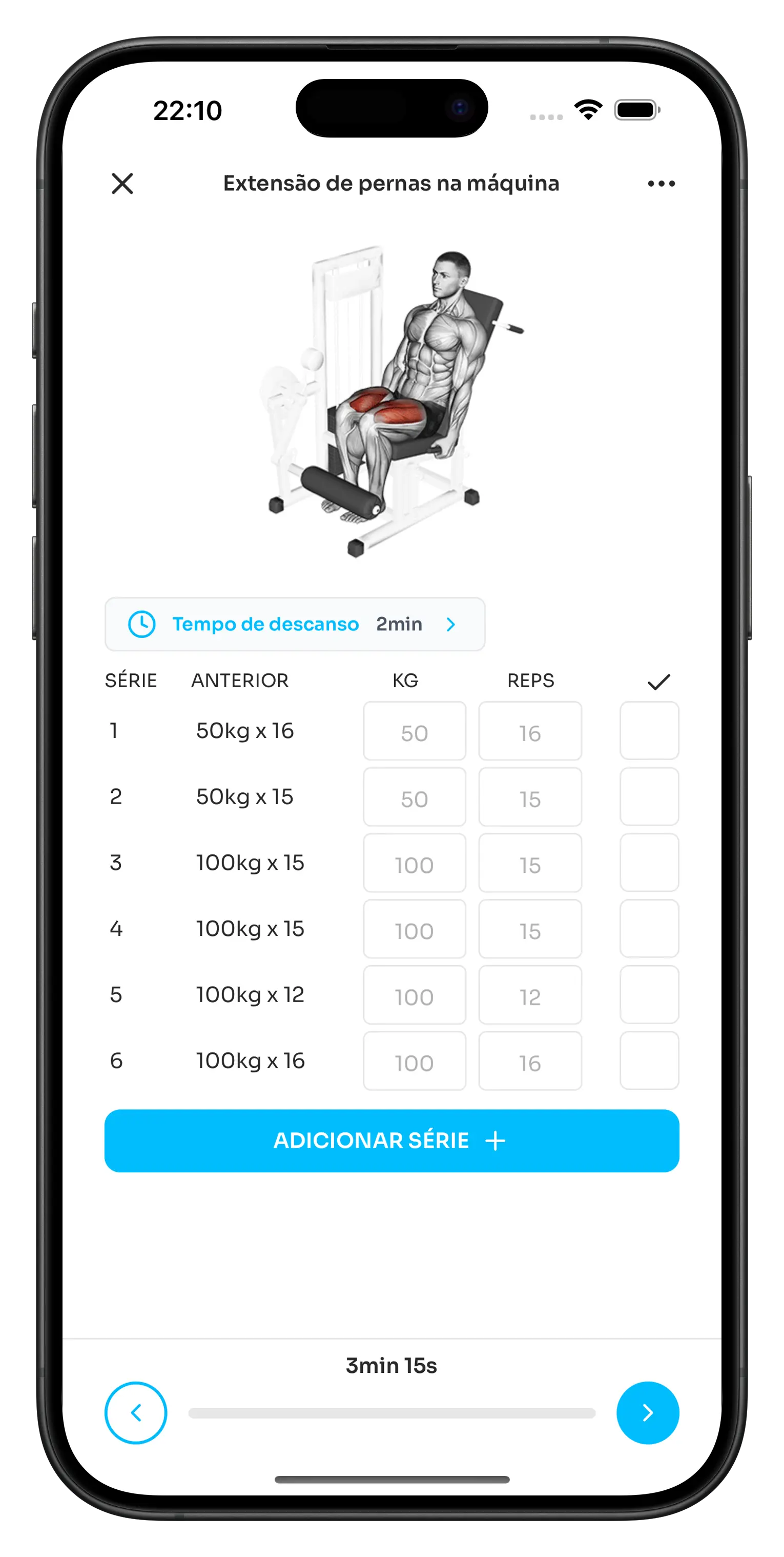 Durante o treino, ajuste cargas e marque séries concluídas em segundos, sem interromper o fluxo.